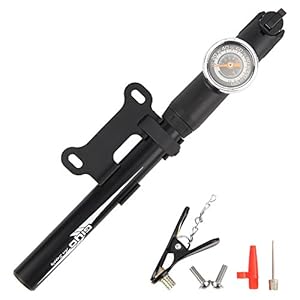 量を確認しながら入れられる目盛付きを。走行前につかうフロアポンプと走行中のパンク修理などに使う携帯ポンプがある。