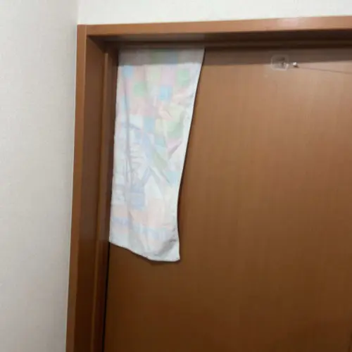 タオルを引っかけてスキマを調整しましたが、ネコの出入り用のグッズもある様です。