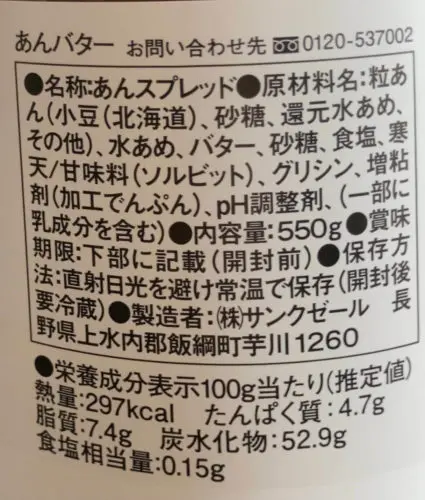 粒あん(小豆(北海道)、砂糖、還元水あめ、その他)、水あめ、バター、砂糖、食塩、寒天/甘味料(ソルビット)、グリシン、増粘剤(加工でんぷん)、pH調整剤、(一部に乳成分を含む)