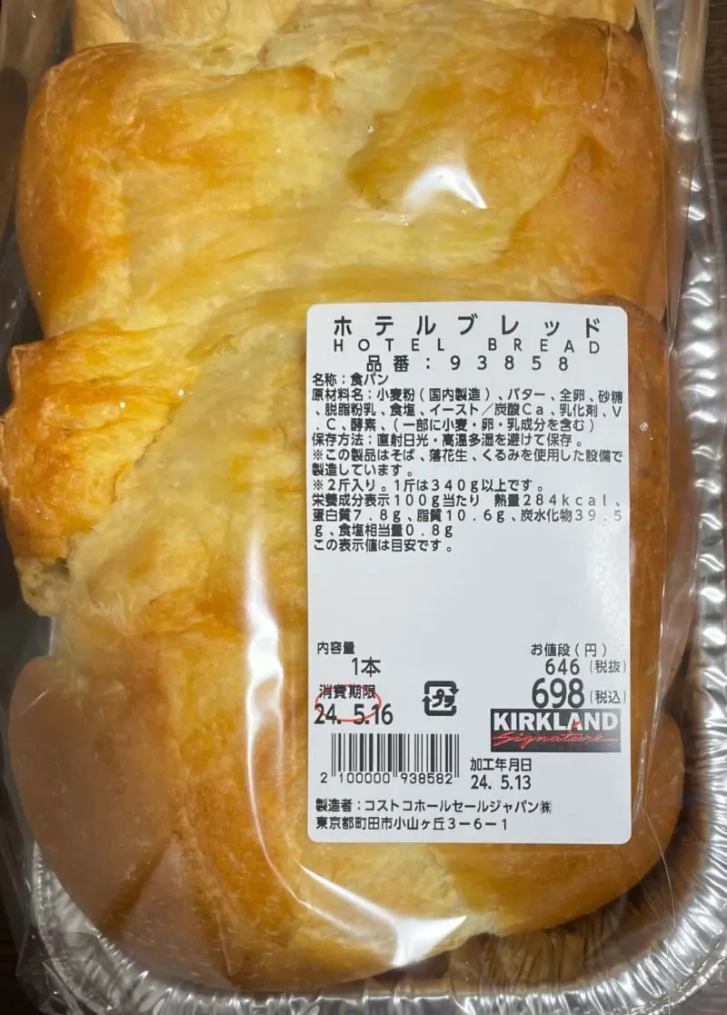 小麦粉(国内製造)、バター、全卵、砂糖、脱脂粉乳、食塩、イースト/炭酸Ca、乳化剤、V.C、酵素、(一部に小麦・卵・乳成分を含む)