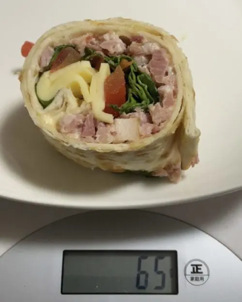 ハイローラーブレッドという、小麦粉にオーツ麦繊維と大麦麦芽粉を混ぜた薄い生地に、ベーコンビッツ、レタス、トマト、ナチュラルチーズをたっぷり挟んだサンドイッチです。