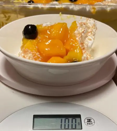 コストコのマンゴームーススコップケーキのカロリーが知りたいんだけど、100gってどの位の量なのかしら?