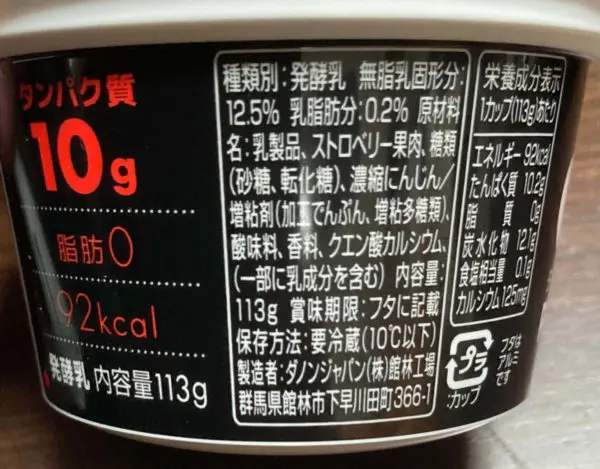 乳製品、ストロベリー果肉、糖類(砂糖、転化糖)、濃縮にんじん/増粘剤(加工でんぷん、増粘多糖類)、酸味料、香料、クエン酸カルシウム、(一部に乳成分を含む)