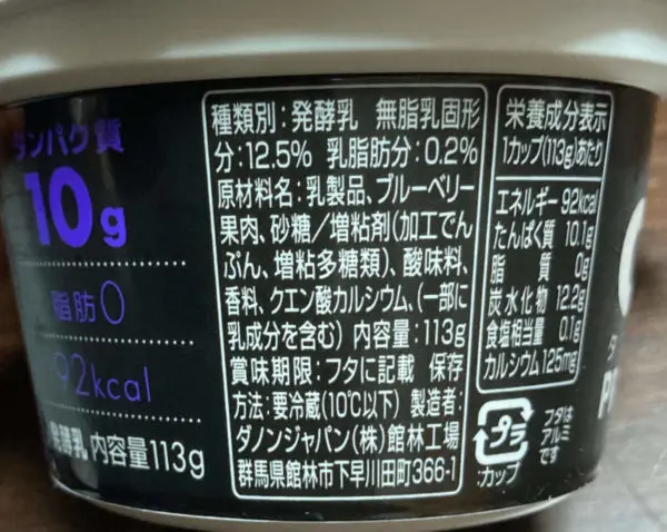 乳製品、ブルーベリー果肉、砂糖/増粘剤(加工でんぷん、増粘多糖類)、酸味料、香料、クエン酸カルシウム、(一部に乳成分を含む)