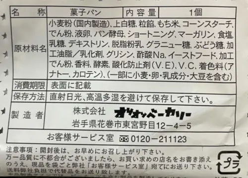 | 原材料名 | 小麦粉(国内製造)、上白糖、粒餡、もち米、 コーンスターチ、でん粉、液卵、パン酵母、 ショートニング、マーガリン、食塩、乳糖、 デキストリン、脱脂粉乳、グラニュー糖、 ぶどう糖、加工油脂/乳化剤、グリシン、酢酸Na、 イーストフード、加工でん粉、香料、酵素、 酸化防止剤(VE)、V.C、着色料(アナトー、カロテン)、 (一部に小麦・卵・乳成分・大豆を含む) |
