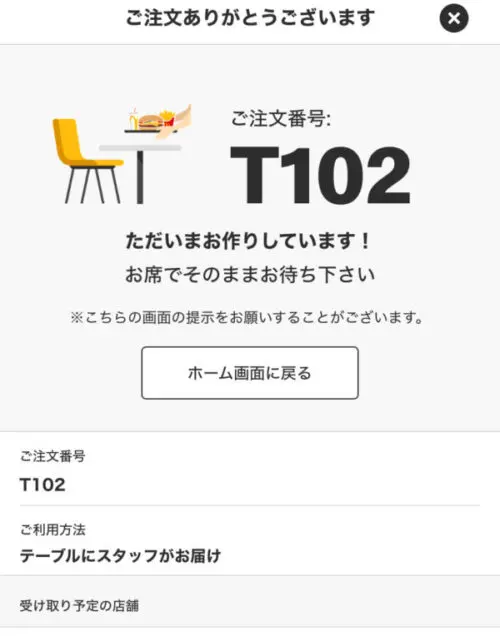 店内でお食事する場合は、「テーブルにスタッフがお届け」が選択できますので、今座っている席に書いてある番号を入力すれば届けてくれます。