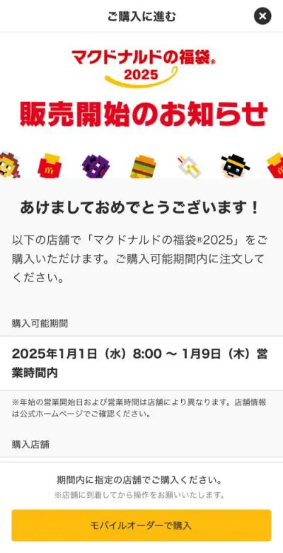 購入画面が現れ、福袋予約時に設定した購入店舗が表示されますので、「モバイルオーダーで購入」をタップします。