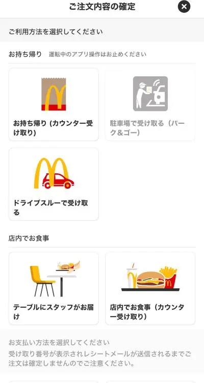 以前は店内のカウンターしか選択できませんでしたが、ドライブスルーでの受け取りも可能になっていました。