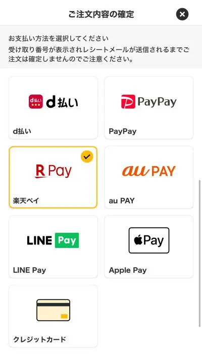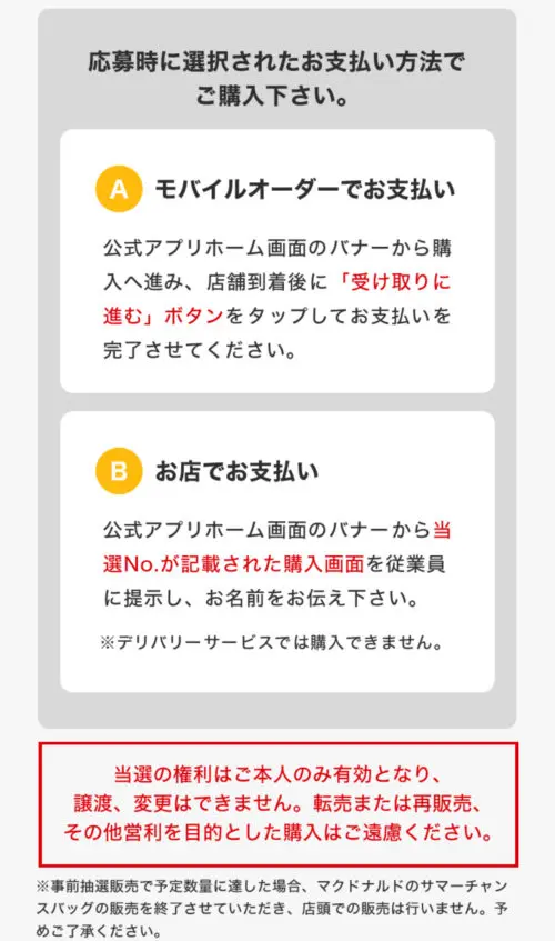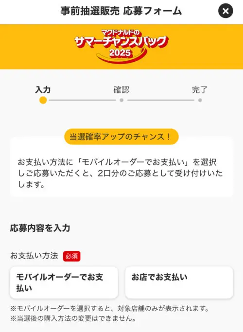 当選確率を2倍にするには、支払方法を「モバイルオーダーでお支払い」を選択して応募すればオッケー!