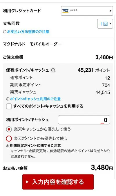 支払い方法を選択後、「入力内容を確認する」「楽天ペイで支払う」をタップして支払い完了。
