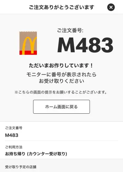このまま「ホーム画面に戻る」をタップしてしまうと、注文番号が分からなくなってしまいます。