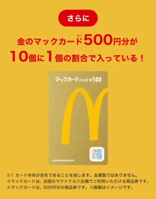 10人に1人の割合で福袋の中に入っている金のマックカードも健在です!
