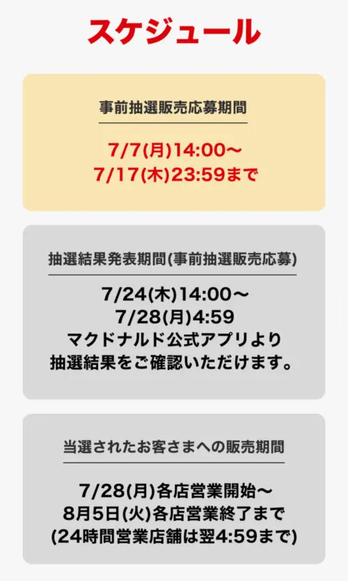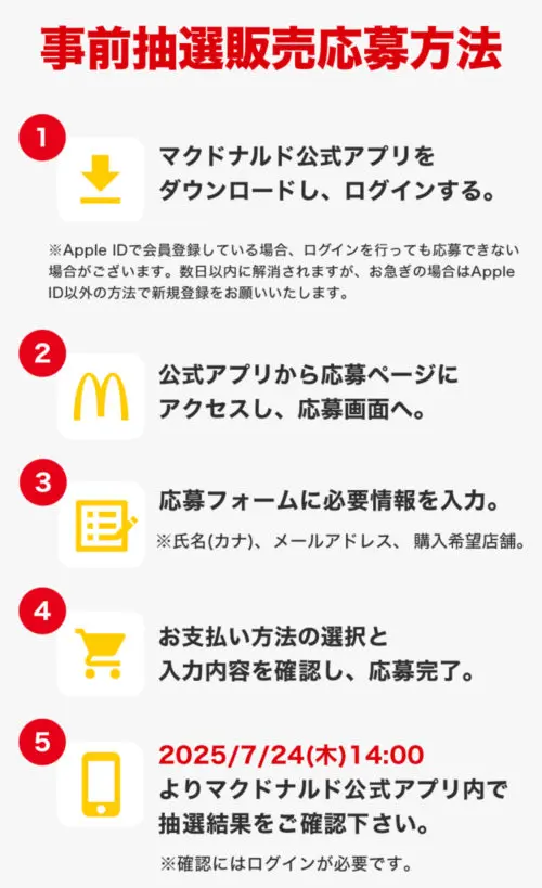 ⑤2025年7月24日(木)14:00よりマクドナルド公式アプリ内で抽選結果を確認。