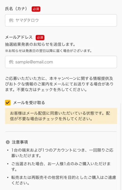 最後に入力内容を確認して応募すればオッケー!メールを受け取るのチェックは入れなくても当選結果は分かりますよ!