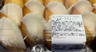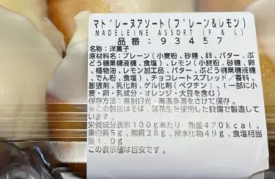 小麦粉、砂糖、卵、植物油、レモン加工品、バター、ぶどう糖果糖液糖、でん粉、食塩、チョコレートスプレッド/香料、膨張剤、乳化剤、ゲル化剤(ペクチ)、(一部に小麦・卵・乳成分・オレンジ・大豆を含む)