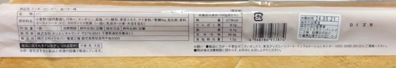 小麦粉(国内製造)、バター、マーガリン、食塩、パン酵母、麦芽エキス、ライ麦粉/酢酸Na、乳化剤、香料、イーストフード、V.C、カロテノイド色素、(一部に乳成分・小麦・大豆を含む)