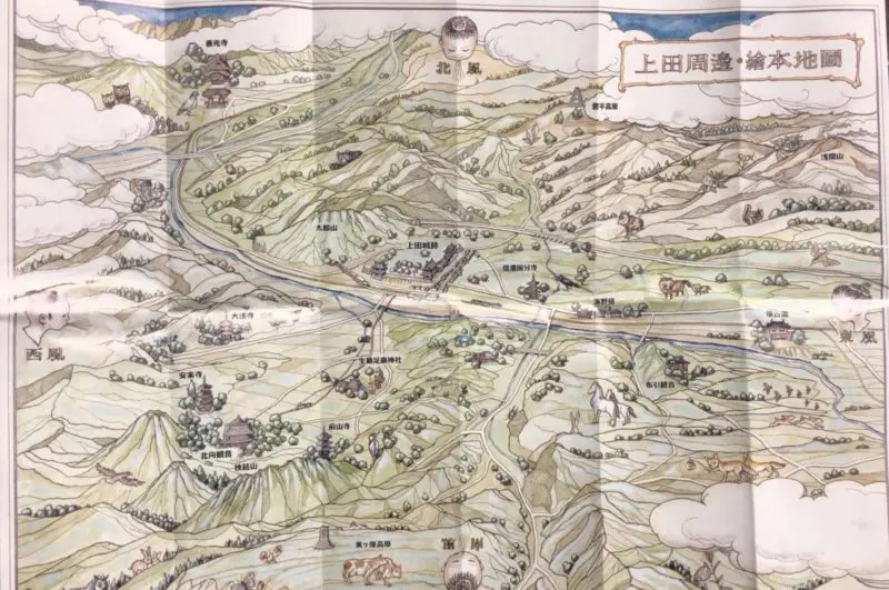 上田城跡、善光寺、菅平高原、美ヶ原高原、信濃国分寺、生島足島神社、布引観音、安楽寺など、とても見やすく素敵な上田周遊・絵本地図が入っています。