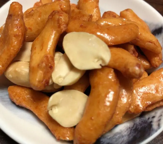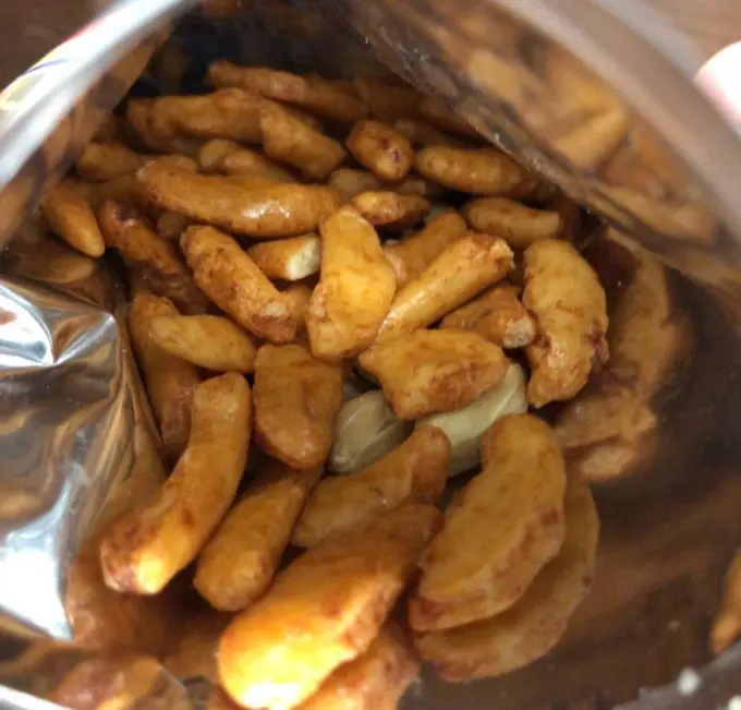 | 原材料 | もち米(国産)、落花生、醤油、水飴、砂糖、植物油脂、 ビール酵母、たん白加水分解物、食塩(沖縄県産28.6%)、 唐辛子(沖縄県産)、魚介エキス/ 調味料(アミノ酸等)、着色料(アナトー)、 増粘剤(加工デンプン)、酸味料、ビタミンB1、 (一部に小麦・落花生・大豆・鶏肉を含む) |